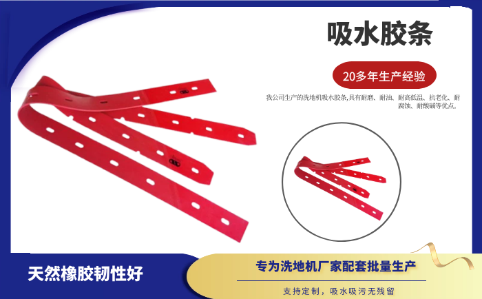 產(chǎn)品說明:吸水膠條是洗地機吸水扒上的重要部件,作用就是與地面接觸,產(chǎn)生一個密封的空間,把地面上的污水通過風機進行回收。吸水膠條一般分為耐油型(進口PU原料)和普通型(進口NR原料)兩種。